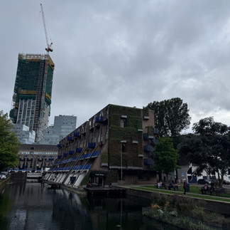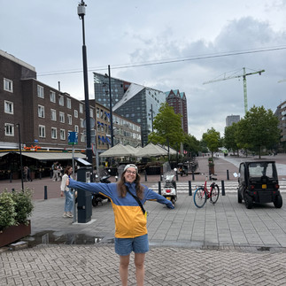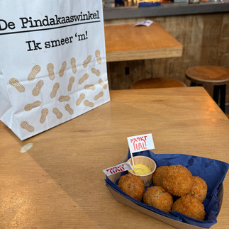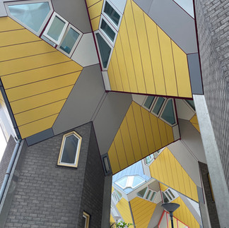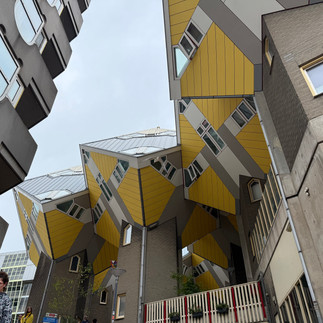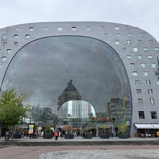 Nous arrivons à Rotterdam et trouvons après quelques galères un parking où notre tank ne déborde pas trop de la place, en plein centre-ville ! Nous avons deux petites heures aussi nous visitons le centre. Nous commençons par le Markhall, un immense hall dans lequel on trouve des stands de nourriture. Il y a une immense fresque au plafond, et des appartements sur les côtés. Nous dégustons des bitterballen, ces croquettes de pomme de terre et viande hachée frites. Un délice ! Je suis hyper triste de ne pas pouvoir manger de harring (hareng), mais on se dit que ce serait vraiment tenter le diable.