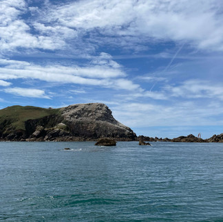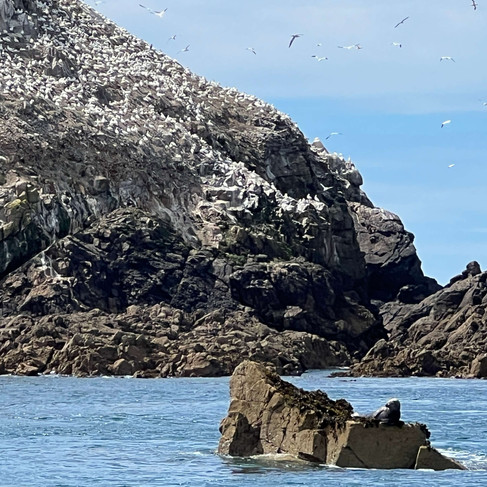 On approche ensuite la dernière île (celle de Rouzic) qui abrite 18700 couples (donc x2 pour avoir le nombre d’individus) de fous de Bassan (chaque point blanc sur les photos = un couple d'oiseaux). Ça c’était le décompte de l’année dernière, depuis il y a eu la grippe aviaire et ils ont très peur du décompte de cette année. Nous apprenons qu’il y a des règles très précises chez ces oiseaux qui ont un nid, toujours le même, qu’ils retrouvent chaque année à leur retour de migration. Ils retrouvent aussi le ou la même partenaire, n’en changeant jamais durant toute leur vie (25 ans). Lorsqu’ils sont là, ils se relaient pour couver l’œuf unique en se guidant par des cris pour que celui qui est parti pêcher retrouve l’autre et se faisant chasser à coups de bec en cas d’atterrissage dans le mauvais nid! L’œuf éclôt après 45 jours et le bébé doit alors apprendre à voler, mais apparemment c’est difficile et certains choisissent de descendre le rocher à pattes et de décoller plus bas, leur duvet leur donnant alors un droit de passage dans les nids des autres. C’est assez fascinant à observer !!
