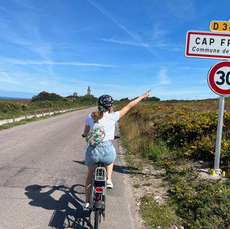 Plus loin, nous atteignons cap Fréhel et il y a des gens partout. Pas de problème, laissons le van sur un évitement et prenons nos vélos ! Nous roulons un bout pour atteindre le fameux cap, c’est splendide. Il y a des fleurs aux couleurs vives et le soleil fait briller la mer, c’est vraiment magnifique. Nous nous promenons un moment le long du bord en faisant le tour du phare, un des plus importants de Bretagne, dont les lumières portent à plus de 53km.