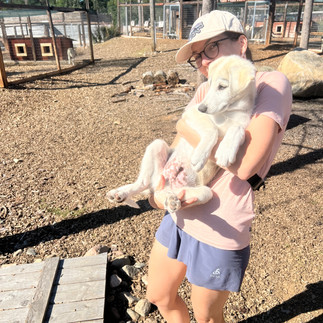 Nous entrons ensuite dans la partie touristique, c’est-à-dire les chiens non compétiteurs, et elle ouvre la porte à 32 bébés qui nous courent dessus, ils sont absolument adorables ! Les bébés mangent 3x par jour contrairement aux adultes qui n’ont qu’un repas le matin (en été). Ils seront tous testés pour voir s’ils deviendront chien de traîneaux ou non, et cette année certains ont été vendus car les portées étaient toutes très grandes et ils ne peuvent pas tous les garder ! Cela dit, ils sont toujours vendus à des personnes faisant de la compétition (les musées) et jamais à des particuliers, c’est donc une race très spécifique. Nous apprenons encore qu’ils sont dehors par tous les temps. La seule exception est quand la température descend à moins de 30 et que leur fourrure n’est pas assez épaisse ou qu’ils ne sont pas assez nombreux pour se réchauffer parmi, alors ils les laissent parfois dedans mais ce n’est pas le cas de cet élevage par exemple. Après ces explications, nous aidons la guide à les remettre dans leur enclos respectif, ce qui est très drôle car certains ne semblent pas pressés de rentrer, puis quittons les chiens à regret.