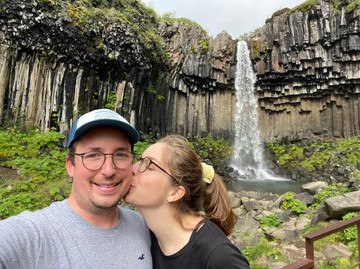 Nous partons ensuite pour le parc national dans lequel nous allons faire une marche pour aller voir la cascade Svartifoss. Comme dit hier, c’est le plus grand d’Europe avec 14000km carré, il couvre 14% du territoire et contient 10 volcans ! Nous marchons donc dans la verdure avec le glacier à côté, un contraste saisissant ! Malheureusement les nuages forment une couche basse et épaisse, ça restreint un peu la vue. 2kil plus loin on arrive à la chute d’eau, entourée de colonnes de basalte mais dans l’autre sens, on dirait qu’elles ont poussé vers le sol, c’est surprenant.