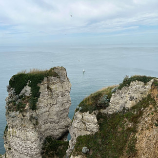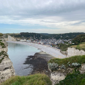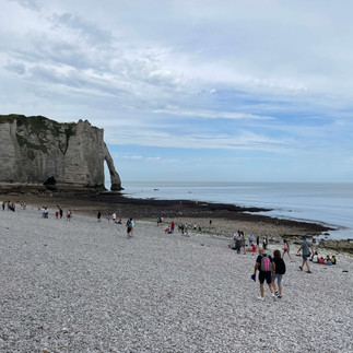 Ce matin, on se réveille au son des coqs qui s’époumonent pendant plusieurs heures. Bon bon ok on se lève ! On se met alors en route pour Etretat pour voir les fameuses falaises de la Côte d'Albâtre et à nouveau c’est la foire d’empoigne. On se parque donc plus loin au bord d’un champs et rejoignons la ville à vélo par une très jolie forêt.