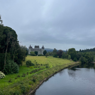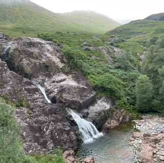 On poursuit notre route et entrons dans les Highlands, le paysage change immédiatement et nous traversons des vallées désolées et mystiques, impression renforcée par le ciel qui est devenu tout gris et un château a l‘air hanté qui surgit dans un contour. On s’attend à voir surgir un farfadet au bord de la route ! On s’arrête voir un point de vue sur une petite cascade, il fait 15 degrés on a bien fait de profiter d’être dehors hier soir !