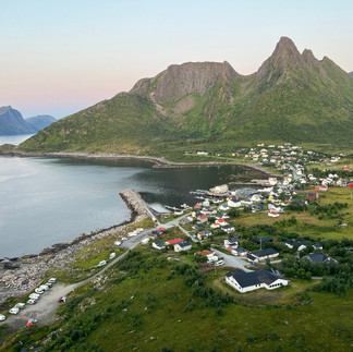 On arrive à une magnifique route où nous sommes seuls au monde nous arrivons à Husøy, drôle de petite ville au pied d’un fjord ou les maisons sont regroupées sur une sorte d’îlot central auquel on accède par une digue. Il y a 270 habitants et une école, une église, un supermarché et un bureau de poste, bref il faut faire la route mais ça vaut le détour !