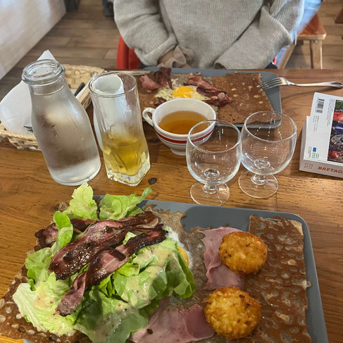 On débarque sur Belle Île à Palais et prenons enfin une galette bretonne, la première de nos vacances, avec une bolée de cidre. La légende veut que les fées de la forêt de Brocéliandre ont jeté leurs contînmes de fleurs dans le golfe du Morbihan après avoir été chassées de leur domaine. 3 des couronnes s’échappèrent et formèrent au large Belle-Ile, la plus grande des îles bretonnes, ainsi que Houat et Hoëdic. A cause de sa position stratégique, Belle Île a été pillée par les saxons et les normands à de nombreuses reprises, et même par les allemandes durant la WW2.