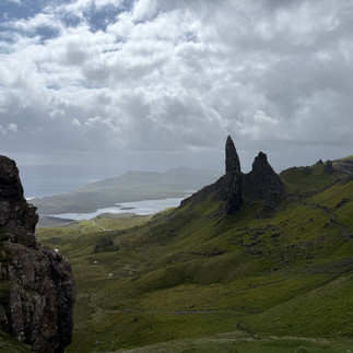 Après une nuit encore agitée par le vent, nous nous réveillons sous la pluie. Après le petit-déjeuner, nous prenons la route pour la péninsule de Trotternish. Le paysage est simplement magnifique, avec plein de gouilles-lacs qui brillent sous les timides rayons de soleil qui font leur apparition. Après quelques miles, nous nous arrêtons pour une petite randonnée. On n’y croyait pas trop mais le ciel se dégage, tout à fait inespéré ! Surtout que je bassine Patrick depuis des semaines avec cette rando. On part donc pour le Old Man of Storr, cet étrange caillou posé tout droit face à la mer. Pour ceux qui ont vu Prometheus on voit cet endroit dans le film. C’est magnifique et on a vraiment une chance incroyable avec le temps ! On grimpe donc voir le caillou du dessus, Patrick doit m’attendre avec mon allure d’escargot mais on arrives bout des 400D+. Ça valait la peine !