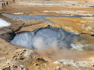 On va ensuite aux bains naturels de Myvatn, les Jardbodin. Moins touristiques que le fameux blue lagoon de la capitale, on profite aussi de ces eaux laiteuses constituées de silicat et de souffre, nous devons enlever tous les bijoux. Un beau moment !